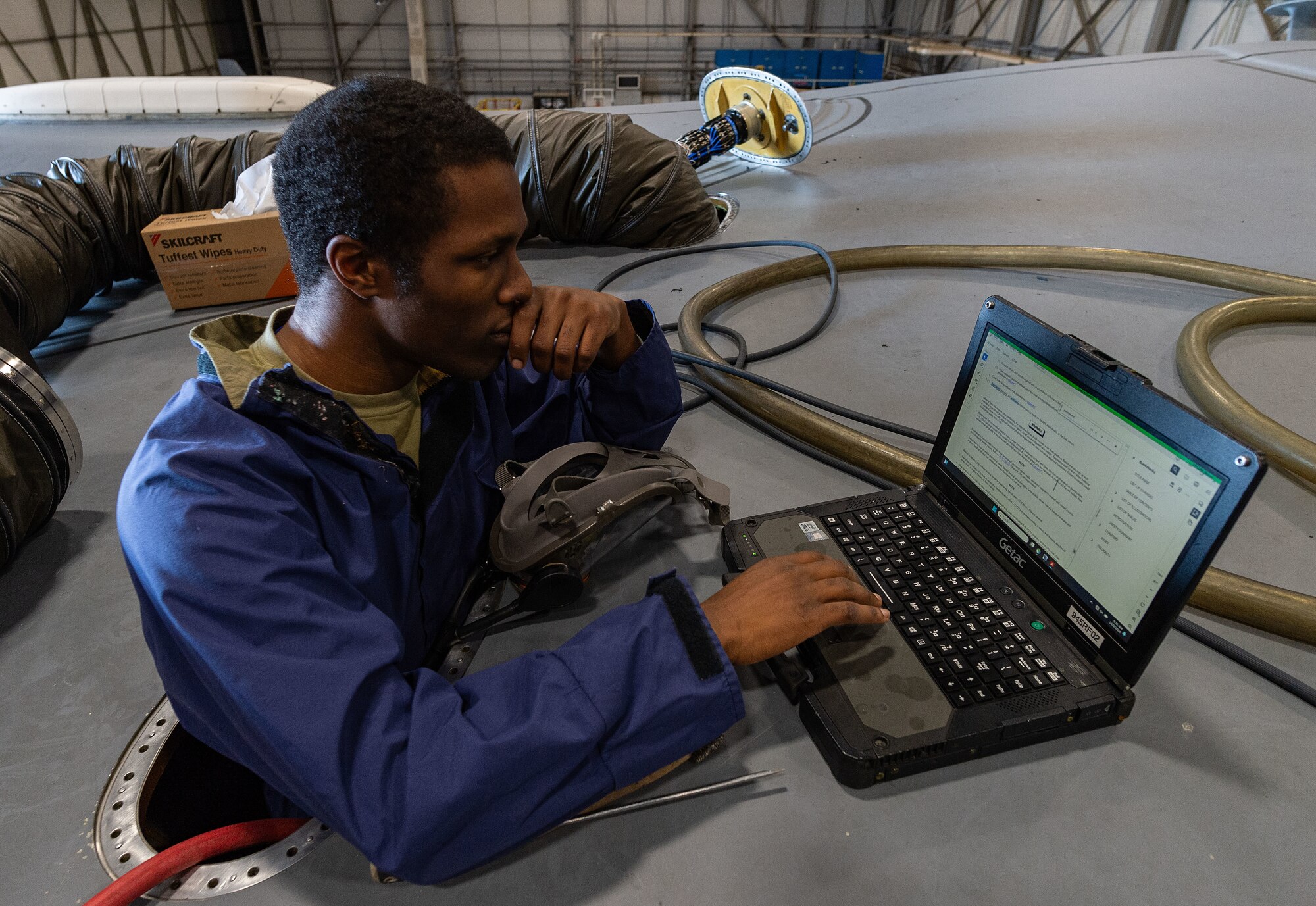 U.S. Air Force Senior Airman Carter Reichle, left, 436th Maintenance Squadron electrical and environmental systems journeyman, and Staff Sgt. Michael Lett, right, 436th MXS electrical and environmental systems apprentice, move an aircraft slide bottle into position for a hydrostatic check at Dover Air Force Base, Delaware, Nov. 6, 2024. The electro-environmental section is part of the accessories flight within the 436th MXS that performs the inspection and repair of C-5M Super Galaxy and C-17 electro-environmental systems and components. (U.S. Air Force photo by Roland Balik)