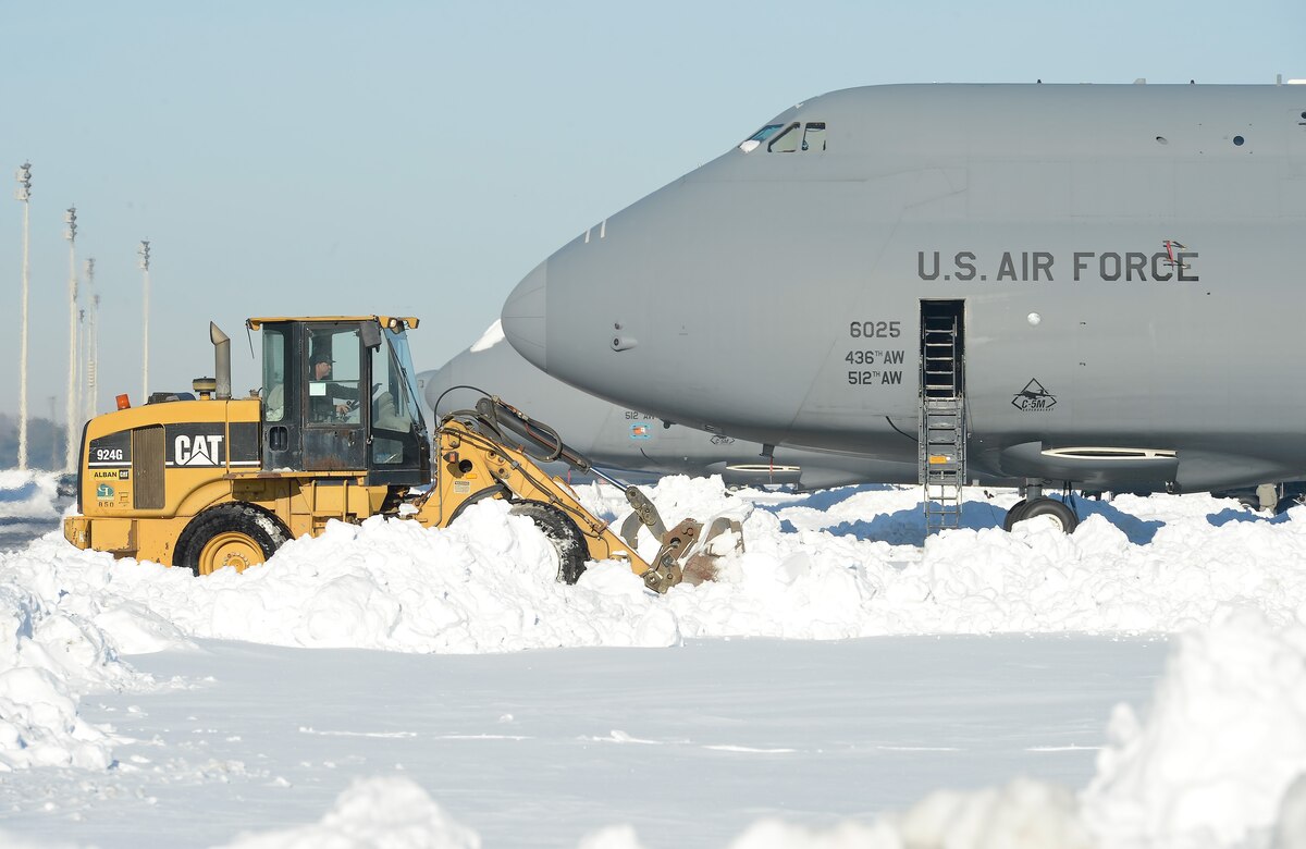 Airmen from the 436th Maintenance Squadron pose with their shovels near the nose of a C-5M Super Galaxy as they take a break from clearing snow and ice from around the aircraft during clearing operations after Winter Storm Jonas Jan. 25, 2016, at Dover Air Force Base, Del. Heavy equipment cleared large open areas while hand-shovels were used near the multi-million dollar aircraft. (U.S. Air Force photo/Greg L. Davis)